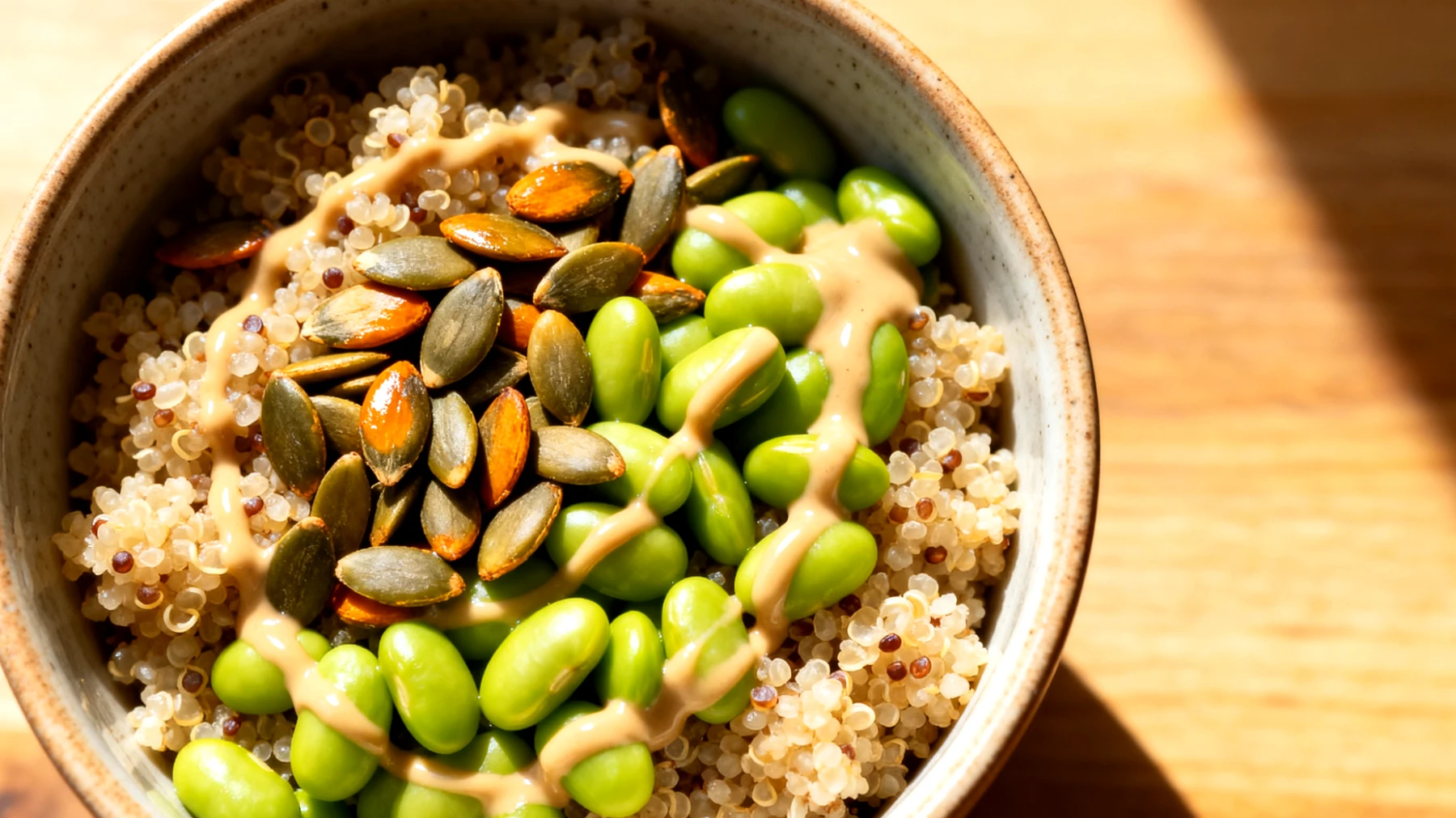 Die grünen Sojabohnen bringen nicht nur Farbe in die Bowl, sondern erhöhen den Proteingehalt noch einmal erheblich. Mit ihrem beeindruckenden Eisen- und Proteingehalt unterstützen sie die Sauerstoffversorgung der Muskulatur. Das enthaltene Eisen ist zwar pflanzlicher Natur und somit weniger bioverfügbar als tierisches Hämeisen, doch hier kommt ein cleverer Synergieeffekt ins Spiel: Das Vitamin C aus einer Beilage wie Paprikastreifen oder Zitronensaft im Dressing verbessert die Eisenaufnahme deutlich. Tiefgekühlte Edamame sind übrigens ernährungsphysiologisch gleichwertig zu frischen und deutlich praktischer. Einfach wenige Minuten in kochendem Wasser ziehen lassen – fertig.