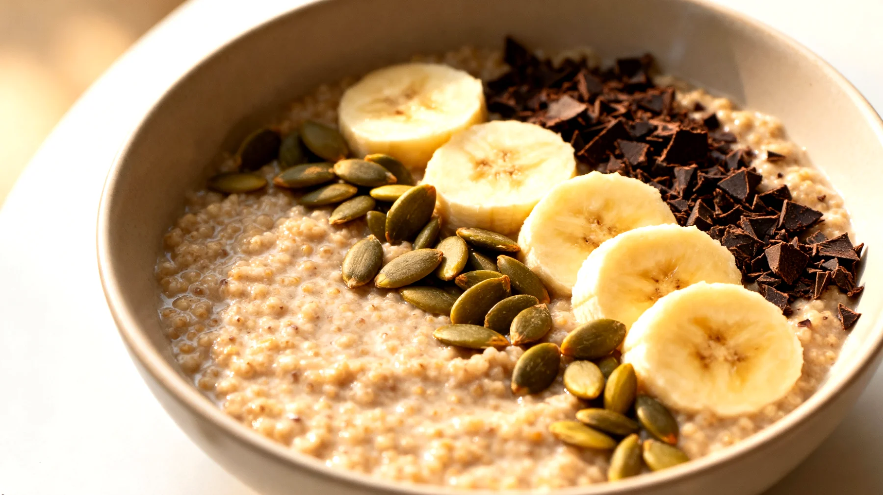 Das Topping aus einer halben bis ganzen Banane, einem Esslöffel Kürbiskernen und einem Teelöffel Kakao-Nibs rundet die Nährstoffbilanz ab. Optional lässt sich das Gericht mit einem Hauch Zimt oder Vanille verfeinern – Gewürze, die den Blutzuckerspiegel zusätzlich stabilisieren können.