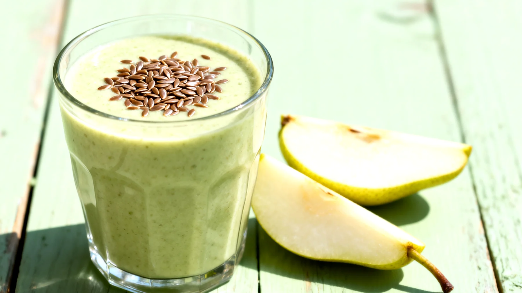 Eine reife Birne sorgt für ausreichend Süße, um die Bitternoten abzumildern. Ein Teelöffel frisch geschrotete Leinsamen reicht für den Anfang, später können es bis zu zwei Esslöffel sein. Wichtig: Zu den Leinsamen ausreichend Flüssigkeit trinken, da sie im Darm aufquellen und Wasser binden. Wer mag, kann noch etwas Zitronensaft oder eine Prise Zimt hinzufügen, um die Geschmackspalette zu erweitern.